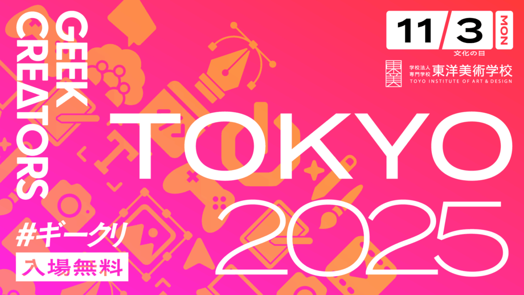 2025年11月3日 / 最終更新日時 : 2025年11月9日 wpunicoadmin お知らせ Geek Creators 2025 TOKYO 第一線で活躍するクリエイターが東洋美術学校に集結し、5つの会場で多彩なセッションを展開!デザイン・映像・イラスト・Webなど、クリエイティブの最前線を体感できる特別な1日です。ここでしか聞けない実践的な話や交流を通じて、新しい刺激と発見に出会えます。 FacebookXBlueskyCopy